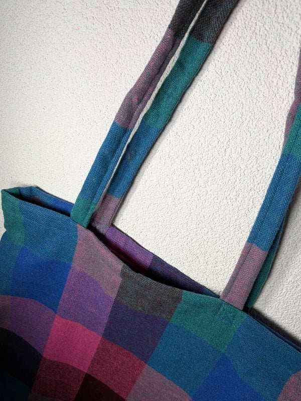Leuk handgemaakt stoffen draagtasje met kleurrijke blauwe, paarse, rode en groene roze vakjes. Ieder tasje is uniek.